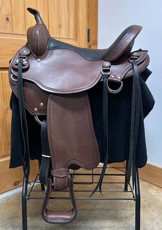 Wide Tree, Dark Oil Hide, Seat S1 (measures 13" at the base of the seat and tapers up to 16" at the top of the cantle), Standard Tree, Round Skirt, Border Hand Tooling, In-Skirt Rigging, Engraved Stainless Steel Conchos, Concho D's & Matching Hardware.