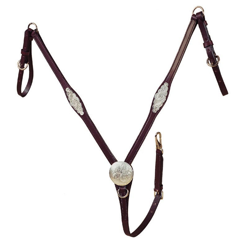 By Tory Leather Co., this Oklahoma style breast strap is engraved silver plate over brass trim, with center concho and flared trim design on each side. These concho center breast straps have a pinch guard and the strap swivels on the ring, to allow for the strap to move as the shoulder moves.